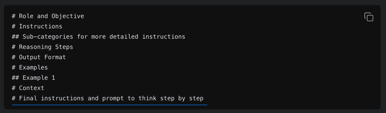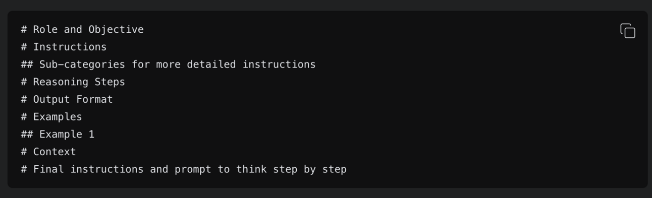 Poradnik wskazuje również punkt startowy, od którego warto wyjść, pisząc nowy prompt. Nie jest to na pewno złoty Graal idealnie dopasowany do każdego modelu AI, ale pokazuje mniej więcej, jakie sekcje i w jakiej kolejności warto zawierać w bardziej rozbudowanych komendach.