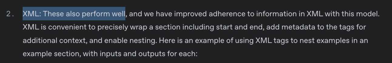 Alternatywą dla składni markdown jest składnia XML, czyli otaczanie sekcji prompta znacznikiem w nawiasach trójkątnych.